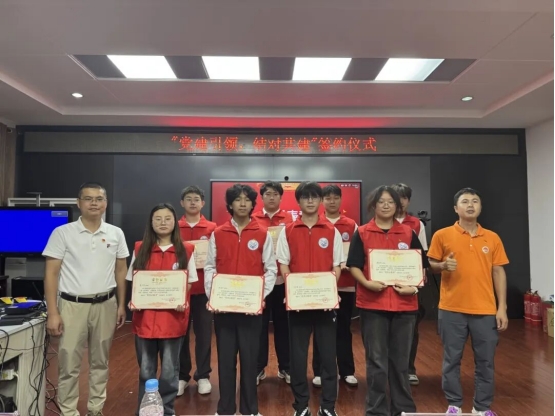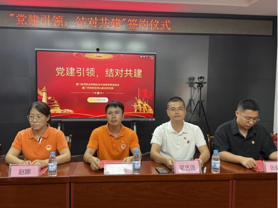 2025年6月14日厦门南洋职业学院机电与信息学院党总支与厦门市同安区同心联合党支部,在同安区汀溪镇政府举行“党建引领,结对共建”签约仪式。出席本次活动的嘉宾有:厦门市同安区同心联合党支部书记 王荣质,同心社会工作服务中心副主任 赵娜,厦门南洋职业学院机电与信息学院党总支书记吴艺强、机电与信息学院学生党支部书记张毅以及部分党员代表。