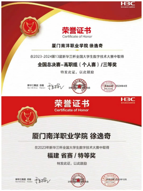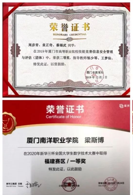虽然信息安全技术应用是较新的专业,但学校已经与厦门欧米克网络科技有限公司建立了紧密的合作关系,能够为学生提供丰富的实习和就业机会,为学生的职业发展提供有力支持。并且学生在2023年12月福建省信息安全管理与评估竞赛中获优秀奖,在2024年11月厦门市信息安全管理与评估竞赛中获二等奖。