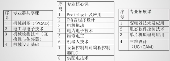 三维设计、现代电器安装与调试、数控加工编程与操作、设备控制与可编程控制器PLC。