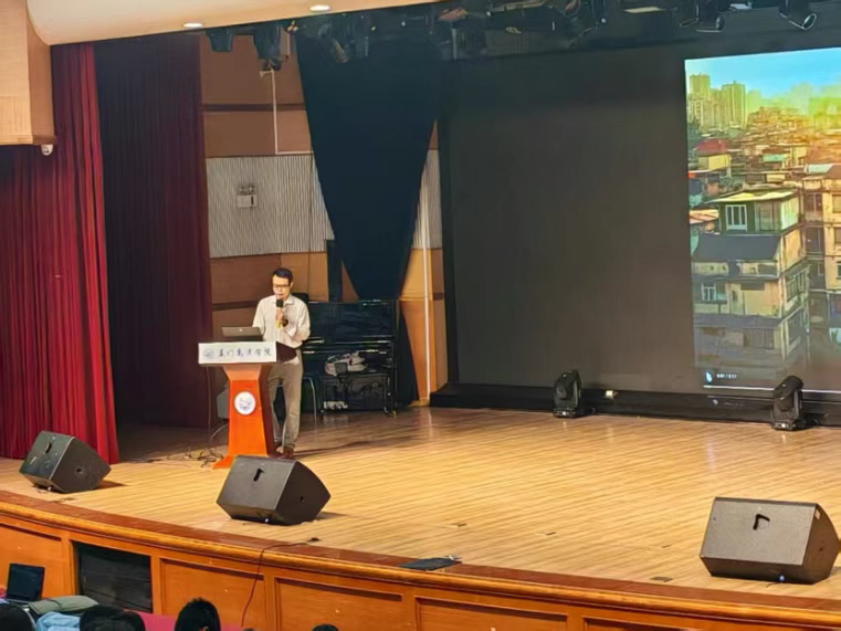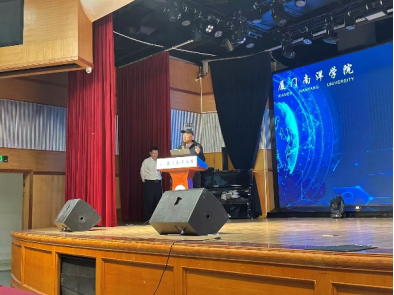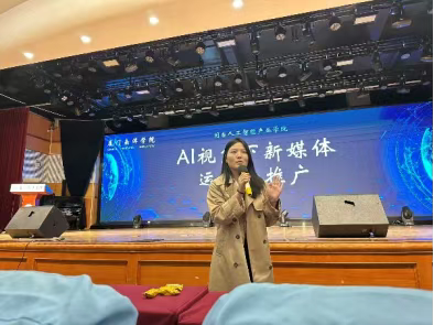 随后,校企合作单位代表——中就科技(福建)有限公司余斌老师登台分享。他结合企业真实案例,展示了AIGC(生成式人工智能)在短视频脚本创作、用户画像分析、精准广告投放等场景中的落地应用,并指出:”未来的新媒体人才,不仅要会‘用工具’,更要懂‘判真伪’、守‘伦理线’。”其务实而前瞻的发言引发在场学生强烈共鸣。