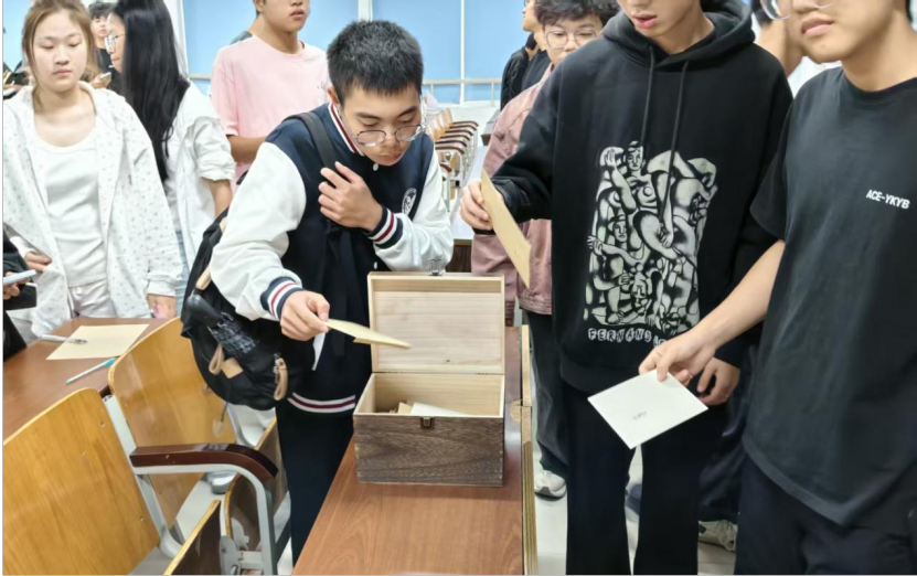 下午15时50分,收信环节准时开启。同学们仔细密封信件,确认署名的标注完整后,依次将信投入入口处的木质收纳盒。随后,两班班长现场为收纳盒上锁、确认密封状态,全程记录保管流程,让每一封承载青春的信件都有了安心的“时光归宿”。
