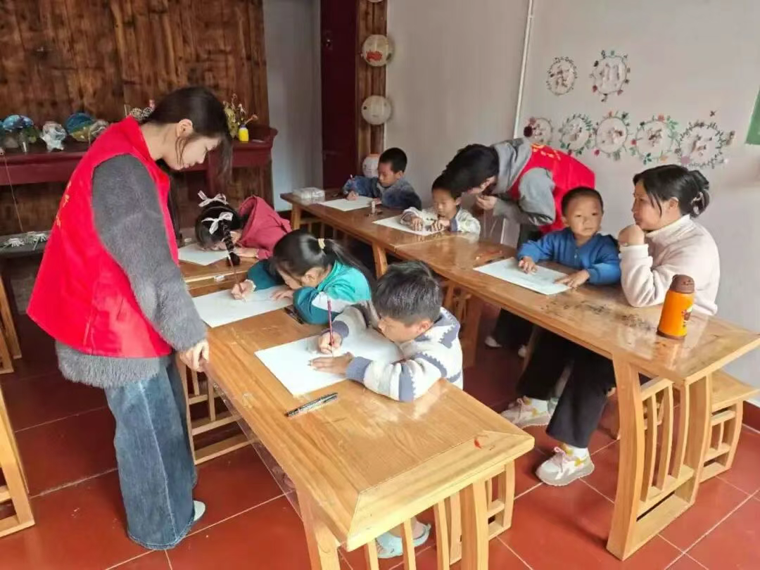 课堂伊始,美术课上满是童真与想象。志愿者们耐心引导孩子们拿起画笔,用五彩颜料勾勒心中的美好模样,从线条勾勒到色彩填充,每一笔都藏着孩童的纯粹创意。志愿者俯身陪伴、细致点拨,指尖流转间,一幅幅充满童趣的画作渐渐成型,孩子们捧着自己的作品展露灿烂笑容,成就感满满。